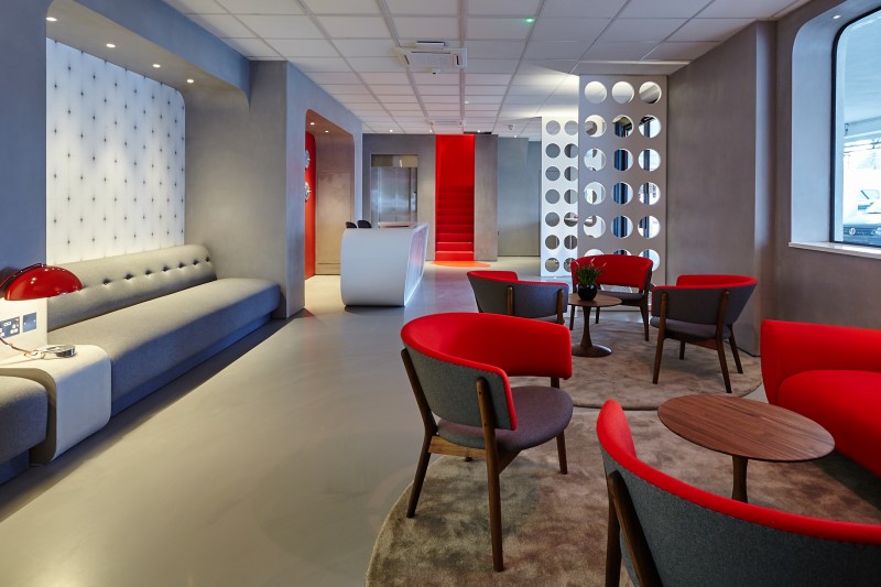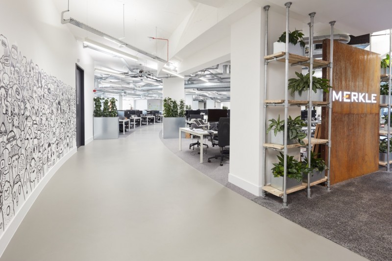 This is particularly suited to companies with a strong brand identity, who want to reflect this in their office space. One such example was Twickenham Studios, where we laid a standard grey poured resin floor to imitate polished concrete, and then created a puddle of red resin at the bottom of the stairs – specifically chosen to match the red in their brand guidelines. “The Reception Area certainly has a “wow” factor and has been received by the industry people who work there – who are used to working in pretty fabulous places – with huge enthusiasm.’ Julie Brownson. This project was such a success it was awarded ‘Small Commercial Project of the Year’ at the 2015 FeRFA Awards.